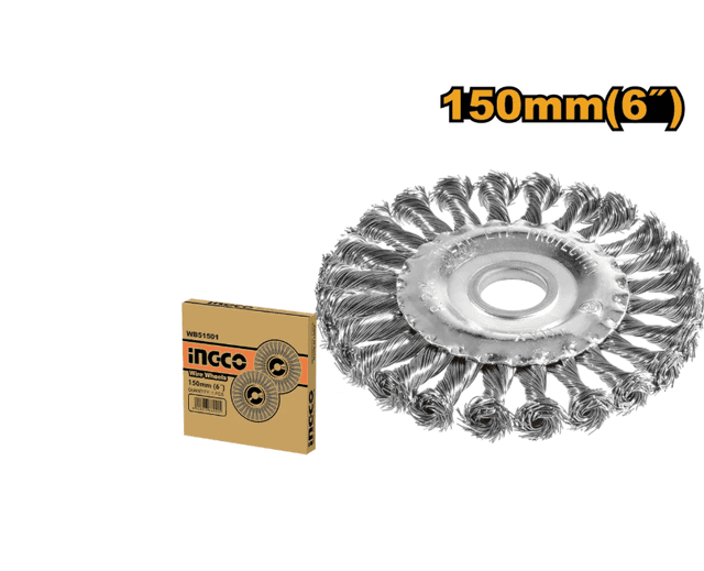 INGCO WB51501 150 mm towlanan disk şekilli şçotkasy laky, boýagy aýyrmak, metal ýüzlerini we önümlerini posdan arassalamak üçin niýetlenendir. Işçi bölegi desse görnüşinde towlanan polat simlerden ybaratdyr. Diametri — 150 mm (6"). Oturtma diametri: 25,4 mm (1"), 22,2 mm we 16 mm ölçegli reduksion halkalary bar. Agramy: 0,52 kg. Gaplanan harydyň ölçegleri: Uzynlygy — 19 sm, Giňligi — 15 sm, Beýikligi — 3 sm