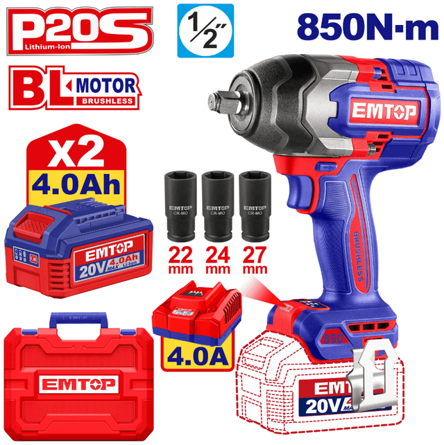EMTOP ECIWL2085 akkumulýatorly gaýkowýort — bu berkidiş enjamlary, gaýkalar we boltlar bilen işlemek üçin kuwwatlylygy we ygtybarlylygy üpjün edýän ýokary öndürijilikli guraldyr. Simsiz dizaýny we täze häsiýetnamalary bilen bu gaýka açar öý ussalary we abatlaýyş, gurluşyk we beýleki tehniki işler bilen meşgullanýan professional ussalar üçin iň gowy saýlawdyr. Häsiýetnamalary: Çotgasyz hereketlendiriji Napräženiýe: 20 V Kwadrat hereketlendiriji: 1/2" Boş aýlanma tizligi: 0-1600/0-2100/0-2400 aýl/min Urgularyň ýygylygy: 0-1500/0-1800/0-2200 urg/min Berkidiş tork momenty: 850 Nm Gaýka aýyrma tork momenty: 1000 Nm Içine gurlan LED yşyklandyryş Toplumynda bar: 3 sany uzyn kelle (22, 24, 27 mm) 2 sany 4,0 Ah akkumulýator toplumy (EBPK20021) 1 sany zarýad beriji enjam (EFCR20411) Zarýad napräženiýesi: 220-240 V ~ 50/60 Hz Daşamaly gutuda gaplanan