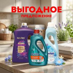 Novitex universal kir ýuwujy geli (2700 ml) + Novitex - suwuk sabyn, 1800 ml (wanil ysly) + Novitex LEGEND egin eşik üçin ýumşadyjy, 1350 ml