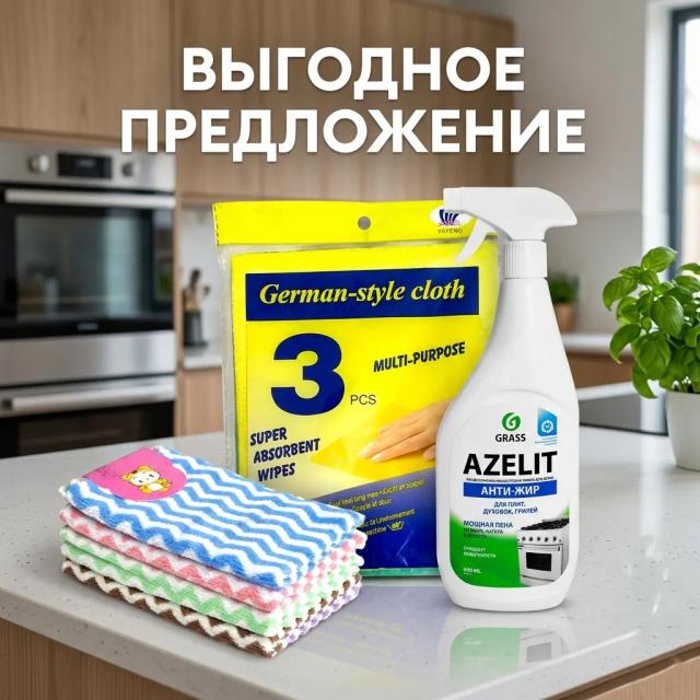 Набор - Чистящее средство Grass Azelit, 600 ml + Салфетки-тряпки для уборки (разноцветные), 5 шт + Комплект разноцветных влаговпитывающих салфеток, 3 шт