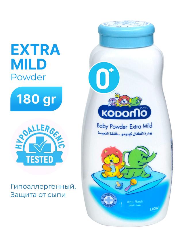 KODOMO Extra Mild çagalar prisypkasy (180 gr) iň kiçi ýaşly çagalar (0+) üçin ýörite işlenip düzüldi. Ol artykmaç çyglylygy netijeli siňdirip, bişmelekeriň we deriniň gijilemesiniň öňüni alýar. Gipoallergen «extra mild» (extra ýumşak) formulasy arkaly, prisypka çaganyň duýgur deresine seresaply ideg edýär, ony gury, tekiz we näzik saklaýar. Suwa düşürilenden soň ýa-da pampers çalşylanda gündelik ulanmak üçin amatlydyr.