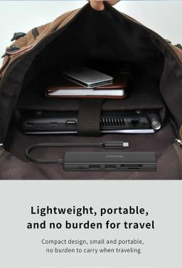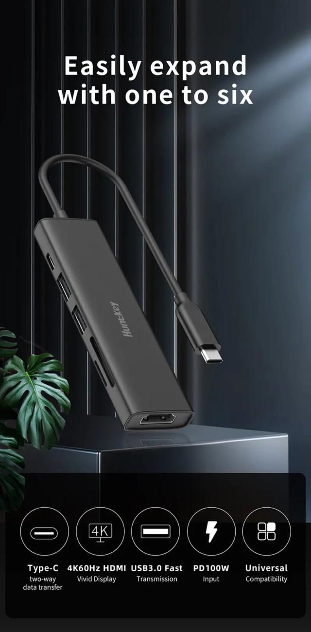 Huntkey D06 6‑in‑1 USB‑C dok-stansiýasy Brend: Huntkey Model: HKDC1500600 Ölçegi: 122 mm (uzynlyk) × 30 mm (ini) × 12 mm (belentlik) Kabeliň uzynlygy: 150 mm Portlar: 2× USB 3.0 1× USB-C (5 Gb/s + PD 100 W) 1× HDMI 1× SD 1× TF (microSD) HDMI çözgüdi: 4K × 2K, 30 Hz maksimum Kuwwat: Içerki giriş: 100 W Maks Çykyş: 92 W Maks Gabatlyk (Compatible System): Windows, Mac OS, Linux iOS, Android, iPad OS, Harmony OS