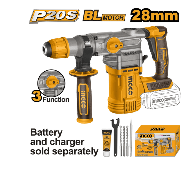 Akkumulýatorly çotkasyz SDS-Plus INGCO CRHLI20288 INDUSTRIAL 20 V 4,5 J perforatory betonda, kerpiçde we tebigy daşda deşik açmak, şeýle hem ýeňil goparyş işleri üçin niýetlenendir. Ol agaçda, metalda, keramikada we sintetik materiallarda deşik açmak üçin hem amatlydyr. Model güýçli çotkasyz dwigatel bilen enjamlaşdyrylan, bu bolsa ajaýyp öndürijiligi we uzak hyzmat möhletini üpjün edýär. Guralyň toplumynda akkumulýator we zarýad beriji enjam ýokdur, bu bolsa size öz wezipeleriňize we iş wagtyňyza görä 2.0/4.0/5.0/6.0/7.5/8.0 Ah göwrümli akkumulýatory saýlamaga mümkinçilik berýär. Guraly şurup öwürji hökmünde ulanmak üçin urgusyz iş tertibi bardyr. Toplumyň düzümi: perforator, ergonomik tutawaç, 8/10/12 SDS-plus burawlary - 3 sany, 160 mm SDS-plus pika - 1 sany, guralyň guýrugy (hwestowik) üçin çalgy ýagy - 1 sany, reduktoryň gapagyny açmak üçin açar, pasport, kepillik talony. INGCO CRHLI20288 perforatorynyň artykmaçlyklary: 3 sany iş tertibi: burawlama / urgyly burawlama / burawlamasyz urgy. Gapdal tutawaç - guraly iki el bilen saklamak üçin. Perforator titremä garşy ulgam bilen enjamlaşdyrylan - ANTI-VIBRATION SYSTEM. Awtomatik gorag muftasy, iş wagtynda howpsuzlygy üpjün etmek üçin buraw garalanda priwody aýyrýar. Akkumulýatory artykmaç ýüklenmeden, gyzmadan we doly zarýadsyzlanmadan goramak ulgamy.