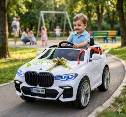 BMW X8 çagalar elektrik awtomobili (Ak reňkli) BMW X-seriýasynyň iň täze we kaşaň dizaýnynda taýýarlanylan bu ak reňkli ulag çagalar üçin ajaýyp sowgatdyr. Ol özüniň owadanlygy we ýokary hili bilen tapawutlanýar. Dizaýny: Uly öň gözenekler, täze nesil LED faralar we açylýan gapylar. Sürüş aýratynlyklary: Ýumşak EVA rezin tekerleri we amortizatorlary arkaly bökdençsiz we sesiz hereket edýär. Dolandyryş: "Ýumşak başlangyç" funksiýasy (ulag sarsman ýöreýär), çaga üçin pedal we ene-atalar üçin uzakdan dolandyryş pulty. Goşmaça mümkinçilikler: Ýumşak deri oturgyç, batareýanyň zarýadyny görkezýän ekran, Bluetooth we USB arkaly aýdym diňlemek mümkinçiligi.