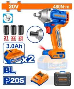 Çotgasyz (brushless) dwigatel Naprýajeniýe: 20 W Kwadrat priwody: 1/2" Boş ýörişiniň tizligi: 0-1200 / 0-1800 / 0-2200 aýlaw/min Urgy ýygylygy: 0-2400 / 0-2800 / 0-3300 urgy/min Berkidiş pursady: 480 Nm Gaýka açyş pursady: 600 Nm Aýratynlygy: Içine gurnalan iş çyrasy (fonar) bar. Toplumda: 3 sany golowka (21, 22, 24 mm) 2 sany 3,0 Ah göwrümli akkumulýator (WLBP530) 1 sany zarýad beriji enjam (WFCP518) Zarýad beriş naprýajeniýesi: 220-240 W ~ 50/60 Gs Gaplanyşy: Götermek üçin niýetlenen keýsde.