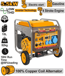Ingco GEIF55001 generatory Hereketlendirijiniň görnüşi: Inwertorly, benzinli, dört hereketli Nominal kuwwaty: 5.0 kW Maksimal kuwwaty: 5.5 kW Iş göwrümi: 389 sm³ Napräženíýe: 220-240 V Aýratynlyklary: Inwertor tehnologiýasy we ýokary kuwwat ony öý, ussahana we duýgur enjamlar üçin ähliumumy çözgüt edýär.