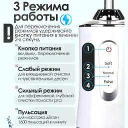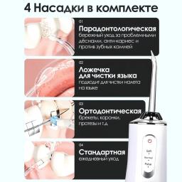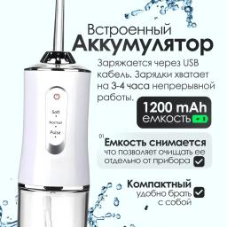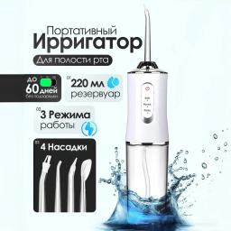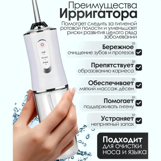 Öý şertlerinde dişleriň we diş etleriniň professional arassalygy üçin niýetlenen döwrebap enjam. Irrigator ýokary basyşly suw akymy arkaly, adaty diş çotgasynyň ýetip bilmeýän kyn ýerlerinden diş dygylaryny we iýmit galyndylaryny netijeli aýyrýar. Aýratynlyklary: Ykjamlyk we awtonomlyk: Güýçli akkumulýatorda işleýär, ulanylýan wagty rozetka bagly däl. Syýahatlara we gezelençlere özüňiz bilen alyp gitmek örän amatlydyr. Dürli iş tertipleri: Suwuň basyşyny sazlamak mümkinçiligi (ýumşak, kadaly, impulsly) enjamy dişleriňiziň we diş etleriňiziň duýgurlygyna görä ulanmaga şert döredýär. Çalşylýan nasadkalar (uçlar): Toplumda köplenç dürli nasadkalar bolýar — dili arassalamak, breketler, implantlar üçin ýörite uçlar we maşgala agzalary üçin standart uçlar. Suwdan gorag (IPX7): Suwa doly çydamlylygy enjamy hatda duşuň aşagynda hem howpsuz ulanmaga we akakar suwuň aşagynda arkaýyn ýuwmaga mümkinçilik berýär. Netijeli öňüni alyş: Diş daşlarynyň emele gelmeginiň öňüni alýar, diş etlerinde gan aýlanyşyny gowulandyrýar we agyz boşlugynyň elmydama täze, ýakymly yly bolmagyna kömek edýär.