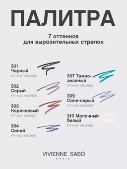 Aýratynlyklary Reňk: №303 КОРИЧНЕВЫЙ Göwrümi: 1.4gr Düşündiriş LINER FLIRTEUR, VIVIENNE SABÓ-dan ýedi uniwersal reňkde göz galamlarynyň hatarydyr. Olary arassa oklary çekmek, tüsse gözleri ýasamak, ýeňil öwüşginler goýmak ýa-da kölegeler üçin esas döretmek üçin ulanyp bolýar. Kompozisiýadaky mumlar toplumynyň kömegi bilen LINER FLIRTEUR-yň dokumasy derä berk ýapyşýar, ulanmak aňsat, kölege we bellik ýok. Galam gabagy dyrmamaýar ýa-da döwmeýär, klassiki Tiffany reňkli agaç göwresini ýiteltmek aňsat. Ulanyş tertibi Göz gabygynyň ortasyndan peýkam çyzyp başlaň, çyzygy gözüň daşky gyrasyna ýakynlaşdyryň. Soňra ýokarky gabagyň içki burçuny çyzmaga dowam ediň. Görnüşi çuňlaşdyrmak we gözleriň reňkini görkezmek üçin kirpikleriň arasyndaky boşlugy dolduryň we gabagyň nemli gatlagyna dokumany ulanyň.