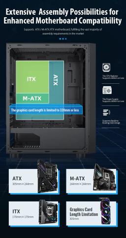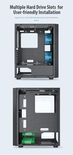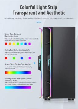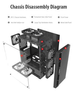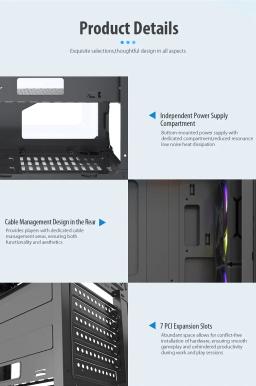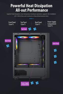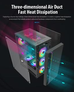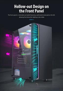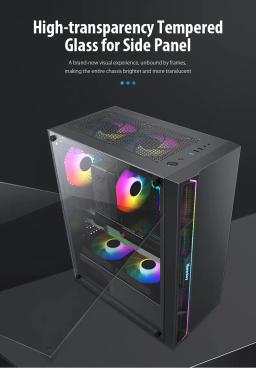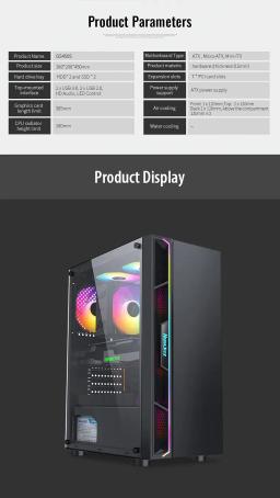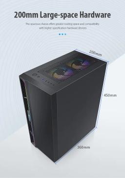 Modeli: GS450S Metal ölçegi: L330 × W200 × H435 mm Korpus ölçegi: L360 × W200 × H450 mm Korpus reňki: Gara Metal materialy: SPCC 0,5 mm Ene plata (M/B): ATX / M-ATX / Mini-ITX Saklaýyş: 2 × 3.5" HDD / 2 × 2.5" SSD Tok üpjünçiligi (PSU): ATX CPU sowadyjy beýikligi (çäklendirme): 160 mm çenli Wideo kartanyň uzynlygy (çäklendirme): 305 mm çenli PCI-E slot: 7 I/O portlary: 1 × USB 3.0, 2 × USB 2.0, Audio Sistem sowadyjylary: Öň bölek: 3 × 120 mm Yzky bölek: 1 × 120 mm Ýokary bölek: 2 × 120 mm Içki bölek: 2 × 120 mm Gutynyň ölçegi: L495 × W250 × H425 mm Aýratynlyklary: RGB yşyklandyryş Aýdyň (şüşeli) gapdal panel
