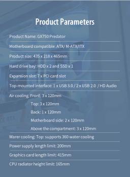 Modeli: GX750A Predator Metal ölçegi: L430 × W218 × H435 mm Korpus ölçegi: L465 × W218 × H461 mm Korpus reňki: Gara Metal materialy: SPCC 0,6 mm Ene plata (M/B): ATX / M-ATX / Mini-ITX Saklaýyş: 2 × 3.5" HDD / 1 × 2.5" SSD Tok üpjünçiligi (PSU): ATX CPU sowadyjy beýikligi (çäklendirme): 165 mm çenli Wideo kartanyň uzynlygy (çäklendirme): 415 mm çenli PCI-E slot: 7 I/O portlary: 1 × USB 3.0 + 2 × USB 2.0 + HD Audio Sistem sowadyjylary: Ýokary bölek: 3 × 120 mm Öň bölek: 3 × 120 mm Yzky bölek: 1 × 120 mm Gapdal bölek: 2 × 120 mm Içki bölek: 3 × 120 mm Gutynyň ölçegi: L513 × W280 × H546 mm Esasy aýratynlyklary: Mesh (tor görnüşli) dizaýn Ýokary bölekde 360 mm suwuk radiator goldawy 12 sanyna çenli sistem sowadyjy goldawy