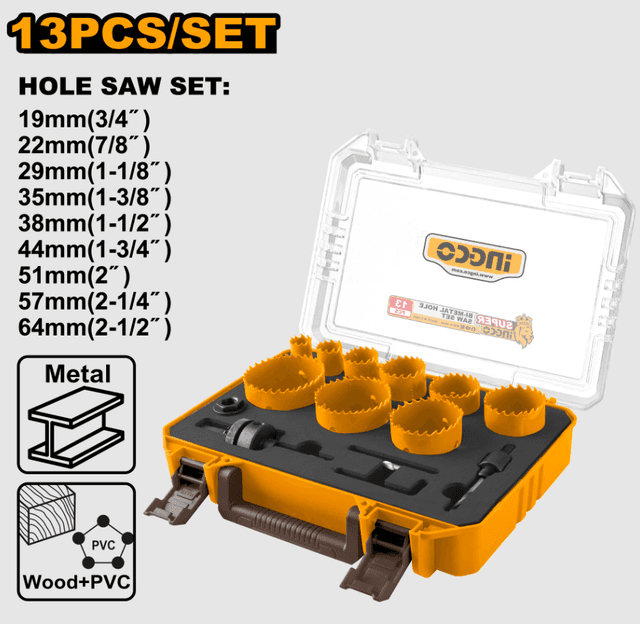13 sanydan ybarat bimetal tegelek pyskalar (koronkalar) toplumy Materialy: HSS M3 bimetal polady Ölçegleri: 19 mm (3/4") / 22 mm (7/8") / 29 mm (1-1/8") / 35 mm (1-3/8") / 38 mm (1-1/2") / 44 mm (1-3/4") / 51 mm (2") / 57 mm (2-1/4") / 64 mm (2-1/2") 1 sany oky (oprawka): 3/8" altyburçly sakgyç (hwestowik), laýyk gelýän ölçegi: 9/16"~1-3/16" 1 sany oky (oprawka): 7/16" altyburçly sakgyç (hwestowik), laýyk gelýän ölçegi: 1-1/4"~8-17/64" 1 sany adapter okuna (oprawka) 1/2-20 rezyba, 5/8-18 rezybaly tegelek pyskany oturtmak üçin 1 sany ugrukdyryjy burgy 1 sany altyburçly açar (altygranlik) Plastik keýsde (gutuda) gaplanan