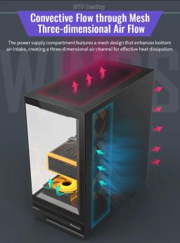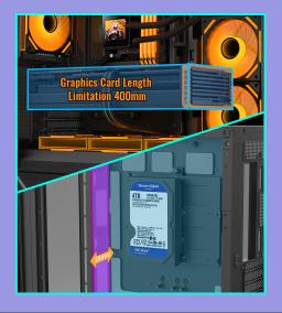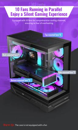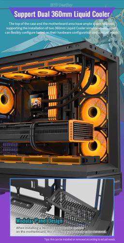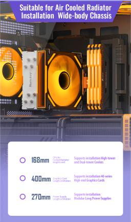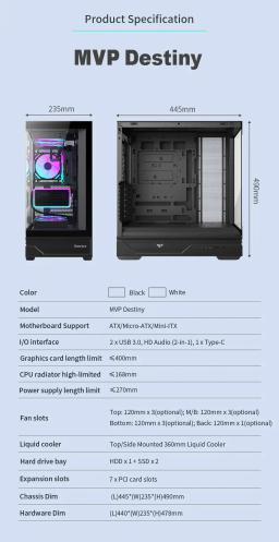 Modeli: MVP Destiny Metal ölçegi: L440 × W235 × H478 mm Korpus ölçegi: L445 × W235 × H490 mm Korpus reňki: Gara Metal materialy: 0.7 mm SPCC Ene plata (M/B): ATX / M-ATX / Mini-ITX Saklaýyş: 3.5" HDD ×1 + 2.5" SSD ×2 Tok üpjünçiligi (PSU): ATX CPU sowadyjy beýikligi (çäklendirme): 168 mm çenli Wideo kartanyň uzynlygy (çäklendirme): 400 mm çenli PCI-E slot: 7 I/O portlary: Type-C ×1 + USB 3.0 ×2 + HD Audio Sistem sowadyjylary: Ýokary bölek: 120 mm ×3 Yzky bölek: 120 mm ×1 Içki bölek: 120 mm ×3 Ene plata tarapy: 120 mm ×3 Gutynyň ölçegi: L566 × W327 × H542 mm Esasy aýratynlyklary: ATX / M-ATX BTF (back to feature) ene platany goldaýar 10 sanyna çenli sistem sowadyjy goldawy Ýokary bölekde 360 mm suwuk radiator goldawy Gapdal paneli we öň paneli aňsat gurnama Type-C porty