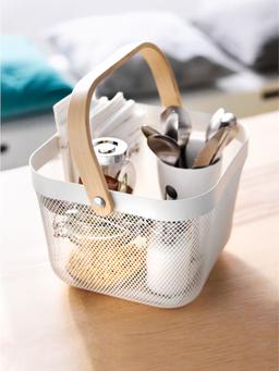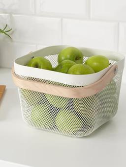 25x26x18 sm ölçegli, ak reňkli sebet. Ýumşak we güýçli gurluşly, dürli zatlary saklamak üçin amatly. Aşhana, ofis ýa-da öýde ulanmak üçin elýeterli we durnukly çözgüt. El bilen götermek üçin tutga bilen enjamlaşdyrylan.