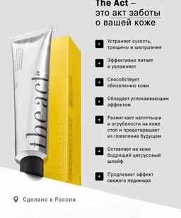 Limonly şerbetiň ýakymly ysy bolan ýeňil krem aýakdaky gurak derini derrew täzeleýär, nemlendirýär we ýumşadýar. Moçewinanyň (20%) ýokary konsentrasiýasy gaba ýerleri netijeli aýyrýar, garalan ýerleri (natoptyş) ýumşadýar we jaýryklaryň bitmegine ýardam berýär, kokos, awokado we limon ýaglary bolsa derini iýmitlendirýär we nemlilik balansyny saklaýar. Alloýe wera, bisabolol, allantoin we pantenol rahatlandyryjy we dikeldiş täsirini üpjün edip, deriniň ýumşaklygyny we ýylmanaklygyny yzyna getirmäge kömek edýär. Ysy: Limon Göwrümi: 150 ml