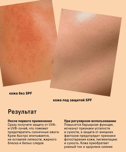 Häzirki zaman himiki süzgüçlere esaslanýan ýüz üçin Gün şöhlesinden goraýjy krem günüň dowamynda ygtybarly goragy üpjün edýär. Ýeňil formulasy çalt siňýär, ak yz galdyrmaýar, düzümindäki trehaloza we fukogel derini çuňňur çyglandyrýar, dikeldýär we onuň tebigy deňagramlylygyny saklaýar. — Gün şöhlesinden ygtybarly goragy üpjün edýär — foto garramagyň we pigmentasiýanyň emele gelmeginiň öňüni alýar — guraklyk duýgusyny aýryp, derini çyglandyrýar — deriniň barýer funksiýasyny dikeldýär — daşky gurşawyň ýaramaz täsirinden gorap, gyzarmalary we gaharlandyrmalary azaldýar — ýagly ýalpyldawuklyk we ak tegmiller galdyrmazdan amatly gatlak döredýär — her gün ulanmak, şeýle hem makiýaž üçin esas hökmünde laýyk gelýär — komedogen däl formula Göwrümi: 60 ml Komedogen däl formula — ýüzdäki deşijekleri (pory) dykmaýan we täze düwürtikleriň döremegine sebäp bolmaýan düzüm. Foto garrama — Günüň ultramelewşe şöhleleriniň täsiri netijesinde deriniň wagtyndan öň garramagy.