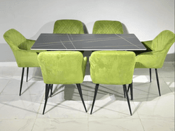 Bu aşhana toplumy gara keramiki üstiň berkligini ýaşyl reňkli karkasyň we oturgyçlaryň täsirli we baý reňki bilen utgaşdyrýar. Stoluň gara keramiki üsti gyzgynlyga, çyzylmalara we çyglylyga örän çydamly bolup, ulanmagyň iň ýokary amatlylygyny üpjün edýär. 140 x 80 sm ölçegi, 6 sany oturgyç bilen bilelikde, ýokary amatlylyk bilen 6 adamy ýerleşdirmäge mümkinçilik berýär. Gara we ýaşyl reňkleriň utgaşmasy giňişlige duýguly çuňluk, täze görnüş we baý stilistik aksent berýär. Esasy artykmaçlyklary: Täsirli Kontrast: Gara üst we ýaşyl karkas/oturgyçlar güýçli vizual effekt döredýär, interýeriňiz üçin aýdyň we stilden doldurylan aksent bolup hyzmat edýär. Keramiki Üst: Uzak ömürli we gigienik, aşhana şertlerine örän çydamly. Optimal Ölçeg (140x80 sm): Oturmak üçin amatly ýerleri üpjün edýän 6 sany adamy ýerleşdirmäge mümkinçilik berýär. Modern Görünüş: Ýaşyl reňk häzirki zaman dizaýnynda nepis we meşhur elementdir. Hilli Oturgyçlar: Oturgyçlaryň 6 sanysy stoluň stili bilen sazlaşykly bolup, amatly oturgyçlar we berk karkasa eýedir. Ideýa etmek: Keramiki üsti çygly mata bilen süpürmeli. Oturgyçlaryň karkasyny ýumşak mata bilen arassalamaly.