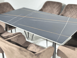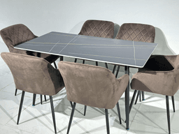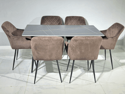 Bu aşhana toplumy gara keramiki üstiň berkligini goňur reňkli (agajyň ýylylygyna meňzeş) karkasyň ýumşaklygy bilen utgaşdyrýar. Stoluň gara keramiki üsti gyzgynlyga, çyzylmalara we çyglylyga örän çydamly bolup, ulanmagyň iň ýokary amatlylygyny üpjün edýär. 140 x 80 sm ölçegi, 6 sany oturgyç bilen bilelikde, ýokary amatlylyk bilen 6 adamy ýerleşdirmäge mümkinçilik berýär. Gara we goňur reňkleriň utgaşmasy giňişlige döwrebap stil, kontrast we tebigy, ýyly atmosferany berýär. Esasy artykmaçlyklary: Tebigy Kontrast: Gara keramiki üstüň we goňur karkasyň utgaşmasy industrial görnüşi tebigy ýylylyk bilen sazlaşdyrýar. Keramiki Üst: Uzak ömürli we gigienik, aşhana şertlerine örän çydamly. Optimal Ölçeg (140x80 sm): Oturmak üçin amatly ýerleri üpjün edýän 6 sany adamy ýerleşdirmäge mümkinçilik berýär. Oňaýlylyk: Goňur karkas gara üstüň agyrlygyny ýeňilleşdirip, maşgala agşamlary üçin amatly gurşawy döredýär. Hilli Oturgyçlar: Oturgyçlaryň 6 sanysy stoluň stili bilen sazlaşykly bolup, amatly oturgyçlar we berk karkasa eýedir. Ideýa etmek: Keramiki üsti çygly mata bilen süpürmeli. Oturgyçlaryň karkasyny ýumşak mata bilen arassalamaly.