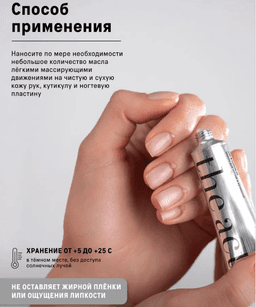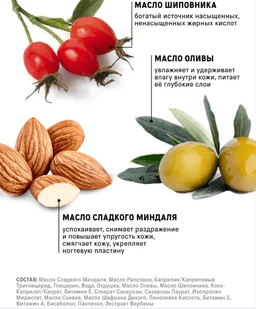 Dyrnaklar we kutikula üçin konsentrirlenen ýag çuňňur iýmitlendirýär we nemlendirýär, derini guraklykdan we daşky gurşawyň täsirinden goraýar. Süýji badamyň, itburun (şipownik), zäfiran (şafran), zeýtun we soýa ýaglarynyň toplumy dyrnak plastinasyny berkleşdirýär, kutikulany ýumşadýar we tenajyklaryň (zausewaýa) döremeginiň öňüni alýar. Bisabolol, pantenol we werbena ekstrakty dikeldişe ýardam edýär we manikýuryň ideg edilen görnüşini uzaldýar. tenajyklaryň (zausewaýa) döremeginiň öňüni alýar ellere ideg edilen görnüş berýär manikýuryň daşky görnüşini uzaldýar Ysy: Badam (Mindal) Göwrümi: 20 ml