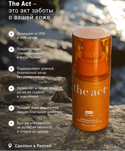 SPF 15 derejeli, ýakymly şimmeri (miltildisi) we ýeňil ideg formulasy bolan beden üçin ýag derini çyglandyrýar, iýmitlendirýär we ýumşadýar. Ýagyň miltildewük bölejikleri deriniň tebigy gözelligini nygtap, oňa sagdyn, özüne çekiji öwüşgin berýär. — Gün garalmasyna päsgel bermeýär, ýöne ony has howpsuz we deňleşdirilen edýär — özüň bilen alyp gitmek amatly — çalt siňýär — ýagly gatlak galdyrmaýar, eşikleri hapalamaýar — ideg ediş we bezeg häsiýetlerini utgaşdyrýar: Günden gorag, çyglandyrma we ýakymly miltildewük öwüşgin — deriniň ähli görnüşleri üçin laýyk gelýär Ysy: Süýt, karamel GÖWRÜMI: 120 ML Şimmer (шиммер) — kosmetiki önümlere goşulýan ýalpyldawuk, miltildewük bölejikler. SPF 15 — Günden gorag faktoriniň derejesi. Gün garalmasy (загар) — Gün şöhlesi sebäpli deriniň reňkiniň üýtgemegi.