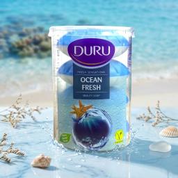Duru Ocean Fresh gaty sabyny bilen deňiz kenarynyň gurşawyna çümüň. Onuň ýörite formulasy derini netijeli arassalaýar we uzak wagtlap dowam edýän arassalyk hem-de buz ýaly salkynlyk duýgusyny sowgat berýär. Sabynyň akwatik ysy günüň dowamynda size güýç-kuwwat berip, ruhuňyzy göterýär. Tebigy düzümi arkaly derini guratmazdan, ony örän ýumşak arassalaýar. Görnüşi: Gaty sabyn. Ysy: Deňiz şemaly. Aýratynlyklary: Çuňňur arassalaýyş, bol köpürjik, tetiklendiriji täsir.