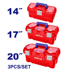 Toplum EMTOP EPBXK0302 gurallary saklamak we daşamak üçin amatly we uzak möhletli çözgüt bolup durýar. Toplum berk PP-plastmassadan ýasalan dürli ölçegdäki (14, 17 we 20 dýuým) üç sany plastmass ýaşçikden ybarat. Her ýaşçik metal toka, ýokary berklikdäki tutawaç we terezi funksiýasy bolan ýokarky gapakda üç sany bölüme eýedir. Topluma 1 sany plastmass patnis girýär. Berk gurluş we ygtybarly gulp howpsuzlygy we amatlylygy üpjün edýär. El gurallary, elektrogurallar we berkitmeler üçin amatlydyr. Tehniki häsiýetnamalary: Model: Gurallar üçin ýaşçikler toplumy EMTOP EPBXK0302 Toplumdaky sany: 3 sany Material: PP (Plastmass) Aýratynlyklar: Metal toka, Ýokary berklikdäki tutawaç, Terezi funksiýaly gapak, 3 ýokarky bölüm Içki elementler: 1 plastmass patnis Toplum we ölçegler (U×G×B): Ýaşik 14 dýuým: 356 x 168 x 160 mm Ýaşik 17 dýuým: 436 x 220 x 205 mm Ýaşik 20 dýuým: 508 x 296 x 261 mm