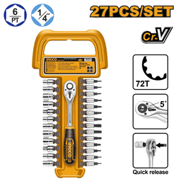 INGCO HKTS14271 INDUSTRIAL 1/4" 4-14 mm 27 bölekden ybarat treşotka we golowkalar toplumy. Toplum 1/4" dörtdilli birleşdiriji ölçegli golowkalaryň görnüşlerini öz içine alýar, bu bolsa ony köp sanly standart mehanizmler we enjamlar bilen utgaşykly edýär. Toplumda dürli görnüşli wintleri we boltary aňsat hem-de täsirli towlamak ýa-da gowşatmak üçin bitli golowkalary tapyp bilersiňiz, bitleriň dürli görnüşleri dürli şlisler we kellejikler bilen işlemäge mümkinçilik berýär. Işçi elementler ýokary hilli 50BV30 hrom-wanadiý poladyndan ýasaldy. Ýokary gatylyk sowuk usulda urup ýasamak we soňraky termiki işläp taýýarlamak arkaly gazanylýar. Golowkany çalt aýyrýan ulgamly treşotka işde goşmaça oňaýlylyk döredýär, ýokary berk polat bolsa treşotkanyň täsirli we uzak möhletli işini üpjün edýär. Saklamak we daşamak amatly bolar ýaly, gurallar plastik saklaýjyda berkidilen. Harydyň görnüşi: golowkalar we bitler toplumy Birleşdiriji ölçegi: 1/4 dýuým Toplumdaky sany: 27 sany Treşotkanyň ölçegi: 155 mm, 1/4, 45T Altyburçly torsew golowkalar: 4, 4.5, 5, 6, 7, 8, 9, 10, 11, 12, 13, 14 mm - 12 sany. Uzynlygy 40 mm bolan bitli golowkalar: SL4-5.5-7; PH1-2; T10-15-20-25-30; H4-5-6-7 - 14 sany. Treşotkanyň materialy: ýokary hilli Cr-V + Cr-Mo polady Golowkalaryň materialy: Cr-V 50BV30 Bitleriň materialy: S2 polady Termiki işlenen, hromlanan örtük