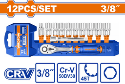 12 sany 3/8" golowka toplumy Komplektde: 10 sany golowka: 8-10-11-12-13-14-15-16-17-19 mm 1 sany 3/8" 45T çalt açylýan treşotka 1 sany 3/8" 3" uzaldyjy Materialy: ýokary hilli 50BV30 hrom-wanadiý polady Hromlanan örtük Plastik saklaýjyda gaplanan