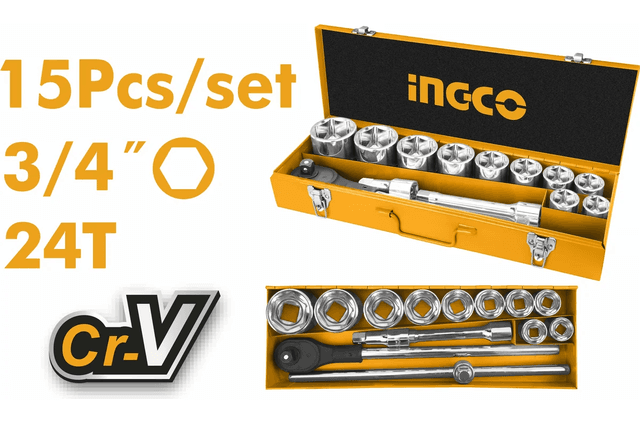 Ygtybarly hünärmen derejeli 3/4" ölçegli 15 predmetden ybarat torsew golowkalar toplumy. Komponentler berk metal keýsde ýerleşdirilen — saklamak we özüň bilen götermek üçin amatlydyr. Toplumyň düzümi: 10 sany torsew golowkasy (6 burçly): 30, 32, 34, 36, 38, 41, 46, 50, 55 we 60 mm 1 sany 24 dişli treşotka tutawajy (3/4") 1 sany süýşýän T-görnüşli worotok, uzynlygy ~520 mm 2 sany uzadyjy (100 mm we 200 mm) Materialy we işlenişi: Hrom-wanadiý polady (Cr-V, 50BV30) Termiki işlenen we sowuk ekstruziýa usuly bilen ýasalan Hromlanan örtük poslamadan goraýar we owadan görnüş berýär Niýetlenişi: Ýokary agramly işler we uly ölçegli berkidijiler üçin niýetlenen: awtoserkisler, senagat abatlaýyş işleri, agyr gurnamalaryň montajy. Berkdigi, ygtybarlylygy we kyn elýeterli ýerlerde uly güýç (ryçag) bilen işlemäge mümkinçilik berýändigi bilen tapawutlanýar.