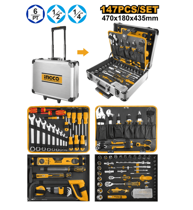 Ýol keýsi (çemodany) slesarlar, awtomehanikler, elektrikler, gurluşykçylar we beýleki hünärmenler üçin niýetlenen gurallar toplumydyr. Dört bölümden ybarat bolup, köp sanly gerekli gurallary we enjamlary ýerleşdirmäge mümkinçilik berýär. Ýol keýsi ýokary hilli materialdan ýasalan bolup, ony götermegi aňsatlaşdyrýan tigirleri we eplenýän tutawajy bardyr. Gulp arkaly berkitmeler gurallaryň ýitmezligini üpjün edýär. Jemi 147 sany harydy öz içine alýar: 1-nji BÖLÜM: Ýarym tegelek ege 200 mm - 1 sany. Derejeölçeg (uruwen) 400 mm, iki taraply tekiz ýüzli - 1 sany. Slesar çekiji 300 g. Polatdan urulyp ýasalan kellesi, taplanan, 45-lik uglerodly polat – 1 sany. Metal kesýän byçgy (nožowka) 300 mm, metal ramaly, ABS plastik tutawaçly, toplumda 65Mn polatdan bolan pultasy bar - 1 sany. Ruletka 5x19 mm, ölçeg şkalasy: metr we dýuým, arassa ABS plastikden korpusy – 1 sany. HEX altyburçly açarlar toplumy: 1.5, 2, 2.5, 3, 4, 5, 6, 8, 10 – 9 sany. 2-nji BÖLÜM: Kombinirlenen açarlar: 6, 8, 10, 12, 14, 15, 17, 19, 22 mm - 9 sany. Otwertkalar, tegelek okly: SL8х150, SL6х125, SL5х100, SL6.5х38 - 4 sany. Otwertkalar, tegelek okly: PH2х150, PH1х100, PH2х38 - 3 sany. 6.35х25mm bitler üçin magnitli 200 mm-lik otwertka - 1 sany. 1000B (V) çenli çydamly dielektrik otwertkalar: SL5х125, PH2х100 - 2 sany. Indikator otwertkasy SL4х140mm - 1 sany. 3-nji BÖLÜM: Kombinirlenen gysgyç (atagzy) 180 mm Cr-V, TPR plastikden ýasalan 2 reňkli tutawaç – 1 sany. apdal kesiji (kusaçka) 160 mm Cr-V – 1 sany. Uzyn burunly gysgyç 160 mm Cr-V, TPR plastikden ýasalan 2 reňkli tutawaç – 1 sany. Simleri gysmak we sydyrmak üçin striper 210mm: Sim kesmek üçin ýiti gyrasy, tyglarynyň materialy - 65Mn gural polady Awtomobil we izolirlenen nakoneçnikleri gysmak (opresowka) Izolýasiýa aýryjy: 0.75, 1.0, 1.5, 1.6, 2.5, 4.0, 6 mm, ýedi dürli görnüşli simi sydyrmak Wint kesiji: М2.6–М5, bäş dürli mis boltary kesmek Angliýskiý (razwodnoý) açar 250 mm CrV, sazlanýan agzy: 0-35 mm – 1 sany. Gysgyçly kleşler 250 mm CrV – 1 sany. Sazlanýan (perestawnoý) kleşler 250 mm Cr-V – 1 sany. Elektrik gaýçysy 145 mm - 1 sany. 4-nji BÖLÜM: Treşotka açary 45T 1/2"х250 mm – 1 sany. Süýşýän kelleli worotok 1/2" х 250 mm. – 1 sany. Udlinitel (uzaltgyç) 1/2" 125 mm, 250 mm. – 2 sany. Birleşdiriji kardan 1/2" – 1 sany. Swiça golowkalary 1/2" 16mm, 21mm – 2 sany. Golowkalar 1/2" 10, 11, 12, 13, 14, 15, 16, 17, 18, 19, 20, 21, 22, 23, 24, 27, 30, 32 – 18 sany. Treşotka açary 45T 1/4"x 150 mm. – 1 sany. 1/4" golowkalar üçin otwertka – 1 sany. Çeýe udlinitel (ýumşak uzaltgyç) 1/4" x 150 mm – 1 sany. Birleşdiriji kardan 1/4" – 1 sany. Udlinitel 1/4" x 50 mm we 100 mm – 2 sany. Golowkalar 1/4" 4, 4.5, 5, 5.5, 6, 7, 8, 9, 10, 11, 12, 13, 14 – 13 sany. 1/4-den 6.35-e, 25 mm bitler üçin adapter - 1 sany. Süýşýän kelleli worotok 1/4" x 115 mm - 1 sany. 10 sany bit 6.35х25mm: Ýasy (шлиц) 6.35х25mm ölçegi: SL3, SL4, SL5, SL6 - 4 sany. Atly (крест) 6.35х25mm ölçegi: PH0, PH1, PH2, PH3 - 4 sany. Atly (крест) 6.35х25mm ölçegi: PZ0, PZ1 - 2 sany. Magnitli bit saklaýjy 6.35х60mm - 1 sany. Kanselýariýa pyçagy 170х18 mm - 1 sany. Tyglaryň toplumy 10 sany. Samorezlar - 36 sany. Çemodanyň açary - 2 sany. Alýuminiý çemodanda gaplanan.