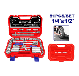 51 sany esbapdan ybarat bolan gural toplumy EMTOP ESKT42511 awtoulaglary we beýleki tehnikalary toplumlaýyn bejermek we hyzmat etmek üçin niýetlenendir. Gurallaryň ähli metal bölekleri ýokary berklikdäki hrom-wanadiý garyndysyndan (CrV) ýasalandyr, bu uzak ömürliligi we ygtybarlylygy kepillendirýär. Topluma iň kiçi ölçegi 4 mm we iň uly ölçegi 32 mm bolan 6 burçly kellejikler, şeýle hem 1/4 we 1/2 dýuým ölçegli oturma orunly (45 dişli) tärçiler girýär. Ergonomik rezinli tutawaçlar eliň ýadamagyny azaldýar. Toplum berkligi ýokary plastmassa keýsde el tutup götermek üçin tutawaç bilen berilýär we mehaniki ýüklere döz gelýär. Arassa agramy 5,5 kg-dyr. Tehniki häsiýetnamalary: Toplumdaky sany: 51 sany Birikdirme ölçegi: 1/4; 1/2 dýuým Kellejikleriň görnüşi: 6-burçly Kellejigiň Min/Max ölçegi (metrik): 4 mm / 32 mm Tärçiň dişleriniň sany: 45 sany Tärçiň uzaldyjy: 50/150 mm Gurallaryň materialy: Hrom-wanadiý garyndysy Tutawaçlar: Rezinli plastmassa Gaplama: Berk plastmassa keýs Arassa agramy: 5,5 kg Ulanylyşy: Awtoulaglary we tehnikalary bejermek we hyzmat etmek