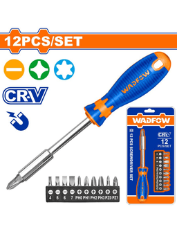 12 sany bitlar toplumy 1/4" X 100 mm towlaýjy bitlarynyň saklaýjysy 11 sany CR-V bitlar: 1/4" x 25 mm Bitlaryň ölçegi: SL4, SL5, SL6, SL7, PH0, PH1, PH2, PH2, PH3, PZ1, PZ2 Süýşürilýän karton gaplamada gaplanan