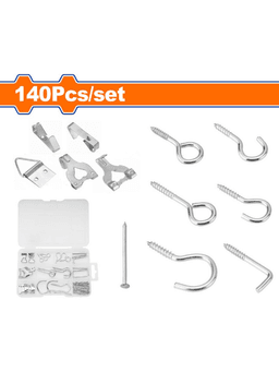 140 sany/komplekt Materialy: uglerodly polat Ýüzüniň işlenişi: sinklenen Surat asgyçlary: 10 funt 8 sany, 20 funt 8 sany, 45 funt 4 sany, 13x13 mm 16 sany Nurbatly çeňňekler: 4,5x65 mm 4 sany, 3,8x50 mm 8 sany, 2,4x30 mm 4 sany Kwadrat çeňňek: 4,4x40 mm 8 sany Nurbatly halkajyklar (gözjikler): 3x30 mm 4 sany, 2x24 mm 4 sany, 3,2x48 mm 8 sany Adaty çüýler: 1,4x25 mm 24 sany, 1,3x13 mm 32 sany “L” görnüşli nurbatly çeňňekler: 3,2x40 mm 8 sany Plastik gutuda gaplanan