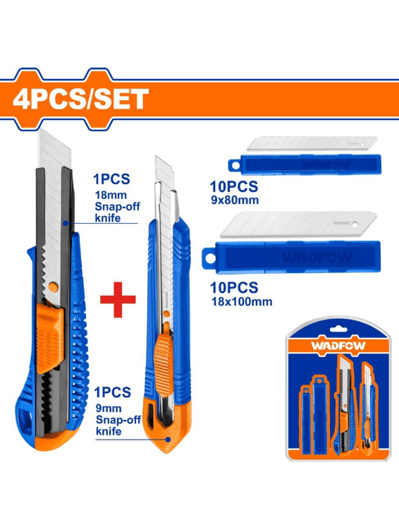4 sany tygy döwilýän pyçaklar toplumy Toplumda bar: 1 sany 9 mm-lik tygy döwilýän pyçak 1 sany 18 mm-lik tygy döwilýän pyçak Korpasy ABS plastikden 10 sany/komplekt 9x80 mm-lik tyglar 10 sany/komplekt 18x100 mm-lik tyglar Ýasy düwmeli Goşa blister gaplamada gaplanan
