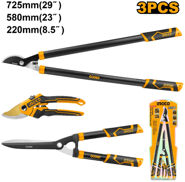 3 sany bagçylyk gaýçylarynyň toplumy, düzümi: 1 sany sekator 220 mm / 8,5 dýuým 1 sany gyrymsy agaçlary gyrkyjy gaýçy 557 mm / 22 dýuým 1 sany pudak kesiji 725 mm / 29 dýuým Termiki işlenen tyg Tyg Teflon örtükli Kagyz asgyçda gaplanan