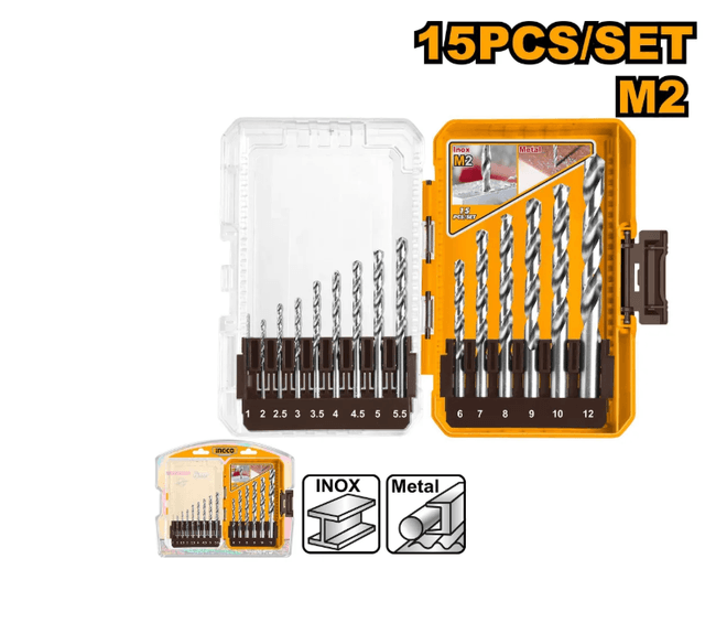 INGCO AKDL51508 INDUSTRIAL — metal bilen işlemek üçin 15 sany M2 HSS burgy toplumy. Burgularyň ölçegleri: 1, 2, 2.5, 3, 3.5, 4, 4.5, 5, 5.5, 6, 7, 8, 9, 10, 12 mm. Materialy: M2.