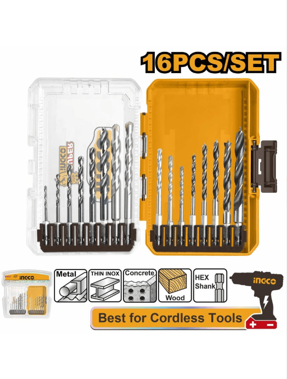 16 sanydan ybarat metal üçin, köpugurly we agaç üçin altyburçly sapjykly burgularyň toplumy 6 sany metal üçin burgy toplumy. Ölçegleri: 2, 3, 4, 5, 6, 8 mm 5 sany köpugurly burgy. Ölçegleri: 4, 5, 6, 8, 10 mm 5 sany agaç üçin burgy. Ölçegleri: 4, 5, 6, 8, 10 mm Goşa blisterde gaplanan
