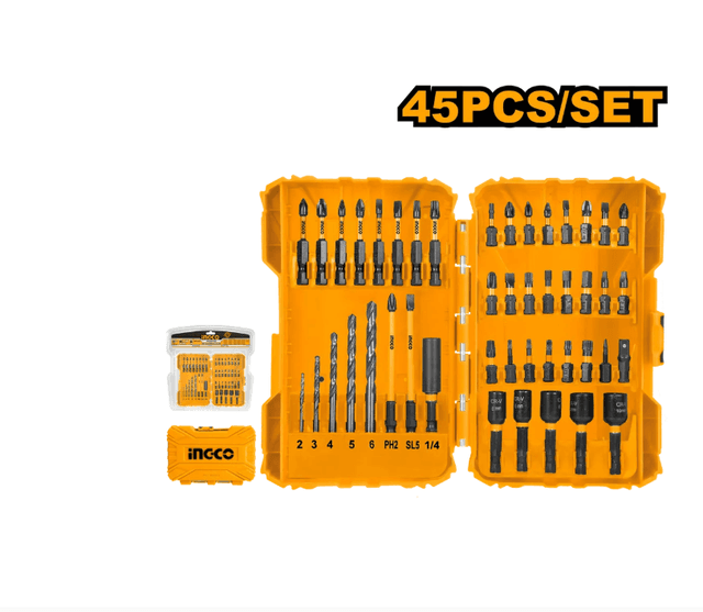 Zarbaly (udaraly) bitlar toplumy 45 sany 50 mm-lik zarbaly bitlar toplumy: 8 sany 25 mm-lik zarbaly bitlar toplumy: 23 sany Adapter: 1 sany 89 mm-lik zarbaly bitlar toplumy: 2 sany HSS swerlolar 5 sany: 2, 3, 4, 5, 6 mm Magnitlenen 48 mm-lik torsewyý golowkalar 5 sany: 6, 7, 8, 9, 10 mm Towlaýjy tutawaç: 1 sany Gaplamasy: plastik keýs