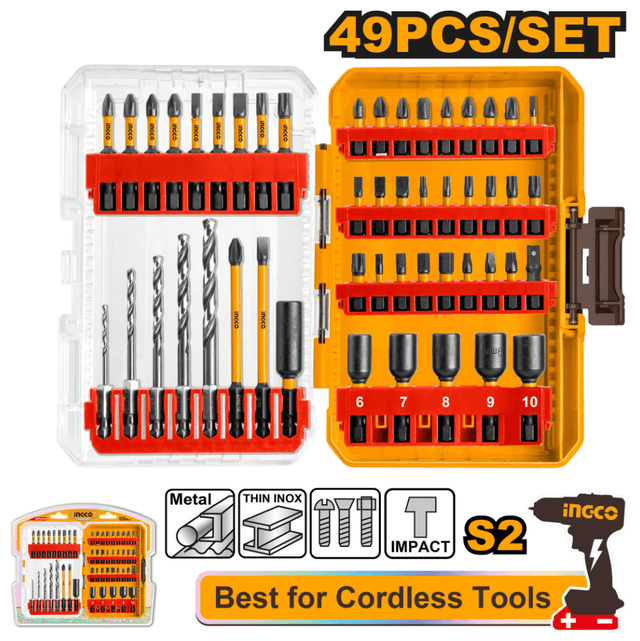 49 sany urgyly atgyfçy bitleriniň toplumy 9 sany 50 mm-lik urgyly atgyfçy bitleri: PH1/PH2/PZ1/PZ2/SL4/SL5/SL6/T23/T30 26 sany 25 mm-lik urgyly atgyfçy bitleri: PH1/PH2/PH2/PH3/PZ1/PZ2/PZ2/PZ3/SL3/SL4/SL5/SL6/H3/H4/H5/H6/S1/S2/S3/T10/T15/T20/T25/T27/T30/T40 1 sany adapter 2 sany 89 mm-lik urgyly atgyfçy bitleri: PH2/SL5 5 sany 4341 HSS burgulary: 2, 3, 4, 5, 6 mm 5 sany 48 mm-lik magnitli golowka: 6, 7, 8, 9, 10 mm 1 sany atgyfçy-bit tutujy Goşa blisterde gaplanan