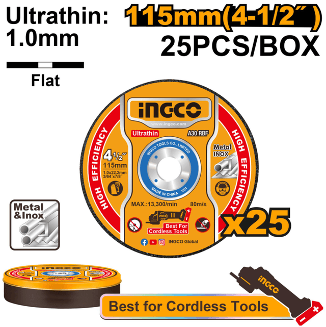 25 sany/toplum. 115 mm (4-1/2") x 1,0 mm (3/64") x 22,2 mm (7/8") ölçegli, metal we poslamaýan polat üçin niýetlenen ýasy merkezli kesiji disk. Litiý-ion akkumulýatorly burçlaýyn yrgyldyly maşynlar (bolgarka) üçin has amatlydyr.