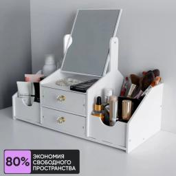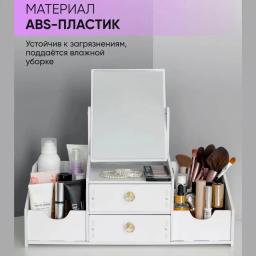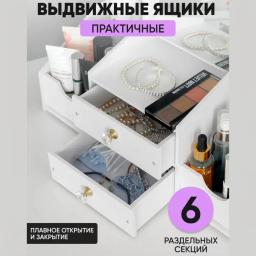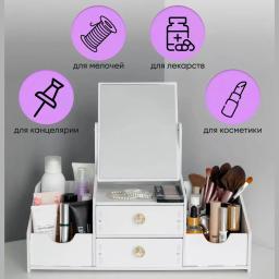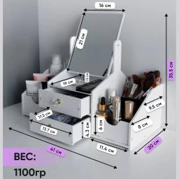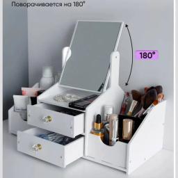 Kosmetikany, çotgalary we şaý-sepleri saklamak üçin stilni we amatly esbap. Ähli gerekli zatlary bir ýere jemläp, kosmetika stolunyň üstündäki tertipsizligi aýyrmaga kömek edýär. Aýratynlyklary: Giňişlik: Birnäçe gatlak we süýşürilip açylýan çekmeler dodak boýaglaryny, kremleri we beýleki ownuk esbaplary amatly ýerleşdirmäge mümkinçilik berýär. Dury dizaýn: Çekmeleriň dury diwarlary içindäki zatlary bada-bat görmäge we gözläp wagt ýitirmezlige şert döredýär. Hilli plastik: Berk, howpsuz we arassalamasy aňsat bolan materialdan ýasalan, çyglylykdan gorkmaýar. Tozandan gorag: Ýapyk çekmeler kosmetikany we çotgalary tozandan hem-de nemden ygtybarly goraýar. Ykjamlyk: Ergonomik görnüşi stolun üstünde az ýer tutup, köp sanly zady öz içine sygdyrýar.