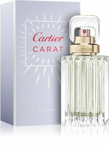 Cartier Carat (50 ml) atyr suwy — bu 2018-nji ýylda çykarylan şöhlelendiriji, täze we kaşaň aýal atyrydyr. Ol gülli (Floral) toparyna degişlidir. Atyr Cartier-iň ştatdaky atyrçysy Matilde Loren tarapyndan döredilip, briliantyň ýalpyldysy we ýaýyň ýedi reňkiniň spektri bilen ylhamlanýar. Ideýa, ýedi sany dürli ak gülüň ulanylmagy bilen "duýgy üçin briliant" döretmekden ybaratdy, olar ýagtylygyň döwülmesini gaýtalaýar. Ýokarky notlar Armyt, Ýaşyl notalar, Bergamot Ertirlik çygy we täzeligi ýatladýan ýalpyldawuk, gaty we arassa başlangyç. Merkezi notlar Giatsint, Lale, Narsiss, Ýabany bägül, Ýazgülü, Ilang-ilang, Fialka Ýedi sany ak güli agdyklyk edýän baý, ýagty we şöhlelendiriji gülli ýürek, arassa, täze buket effektini döredýär. Giatsint we narsiss ýeňil otly ýaşyllyk berýär. Esasy notlar Mimoza, Ak musk Gülli notalary pugtalandyrýan, ýöne atyryň umumy howalylygyny we täzeligini saklaýan ýeňil, arassa we birneme pudraly esas. Umumy täsiri: Carat — bu ýagty, ýaşyl we intensiwe täze gülli atyrdyr. Ol süýji däl, örän arassa we nepis. Gündizki ulanmak, ýaz we tomus üçin, şeýle hem çylşyrymly, kristal ýaly arassa gülli ysy gözleýänler üçin ideal.