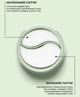 Патчи глубоко увлажняют, успокаивают, а также защищают и восстанавливают нежную кожу вокруг глаз. Благодаря активному комплексу с антиоксидантами, продукт осветляет кожу, уменьшает отёчность и тонизирует. — Мгновенно увлажняют — Осветляют тёмные круги — Снимают отёчность — Оказывают охлаждающий и успокаивающий эффекты — Разглаживают мелкие морщинки — Два размера для применения на разных зонах лица — Экологичный и перерабатываемый тканевый материал — Плотно прилегают и не смещаются в упаковке 80 шт
