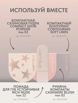Aýratynlyklary Reňk: №03 ТЕПЛЫЙ БЕЖЕВЫЙ Göwrümi: 7gr Düşündiriş Agramsyz atlas dokumasy bolan pudra, tebigy ýarym matdan ýasalan we terlenen deriniň täsirini döredýär, aşa guraklyk ýa-da ýalpyldawuk owadanlygyny nygtaýar. Önüm deriniň kemçiliklerini gizleýär, tekizleýär we makiýažy düzetmek üçin amatly. Kompozisiýadaky mineral pigmentler, ary mumy, E witamini, mika we emolýentler reňkiň birmeňzeşligini, tekiz örtügini we maskanyň täsiri bolmazdan ulanylmagyny aňsatlaşdyrýar. Ulanyş tertibi Düşünjeli täsir üçin pudrany çotga bilen çalyň ýa-da has dykyz örtmek üçin toplumyň içine girýän gubkany ulanyň.