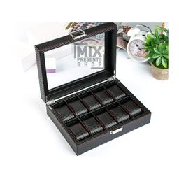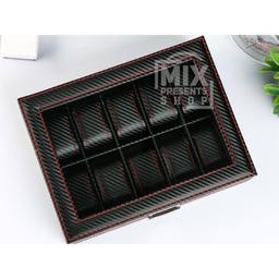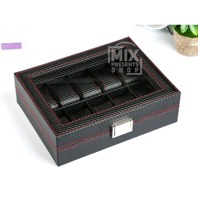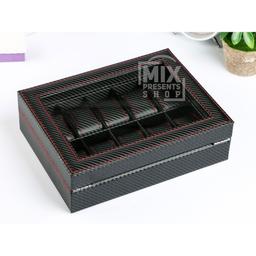 Шкатулка для часов "Карбон с красной строчкой" из ЭКО кожи (10 отделений)