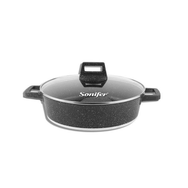 Sonifer SF-1128-36 professional skoworodkasy (diametri 36 sm) — bu giň gerim bilen nahar taýýarlaýanlar üçin kuwwatly guraldyr. Uly ölçegi saýasynda, ol uly maşgala naharlary, baýramçylyk dabaralary ýa-da professional aşhanalarda ulanmak üçin ideal amatlydyr. Ýokary hilli guýma alýuminden ýasalan korpusy önümleriň ýanmagynyň öňüni alyp, çalt we birsydyrgyn gyzmagy üpjün edýär. Ýokary berkli döwrebap anti-prigar örtügi ingredientleriň tebigy tagamyny we peýdasyny saklap, minimal ýag bilen nahar taýýarlamaga mümkinçilik berýär. Güýçlendirlen tutawajy ygtybarly berkidilen we naharyň uly agramyna çydamak üçin döredilen bolup, prosesi doly gözegçilikde saklamaga kömek edýär. Sonifer SF-1128-36 — bu bir skoworodkada jemlenen industrial ygtybarlylyk we öý oňaýlylygydyr.