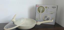 Alýumin. Diametri 24.0 sm. Şekili tegelek. Gapak bar. Çuňlugy 5.0 sm. Çeňňek däl örtük bar. Induksiýa bişirijiler üçin bar.