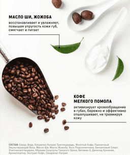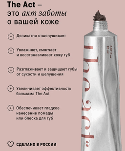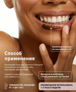 The Act dodak skrabyny, gurak we ölen öýjükleri aýyrýar, dodaklaryň derisini ýumşak we nemlendirilen galdyrýar. Onuň ownuk kofeniň we ownuk ýer badamyň (grek hozy) esasyndaky inçejik eksfoliirleýji (arassalaýjy) düzümi, derini zaýalamazdan, netijeli, ýöne seresap täzelenmäni üpjün edýär. Mikroserkulýasiýany gowulandyrýar, dodaklara açyklyk we göwrüm berýär. Derini ýumşadýar we nemlendiriji serişdeleriň gowy siňmegini üpjün edýär. Dodaklary makýaža taýýarlaýar. Ysy: Kofe, wanil Göwrümi: 20 ml