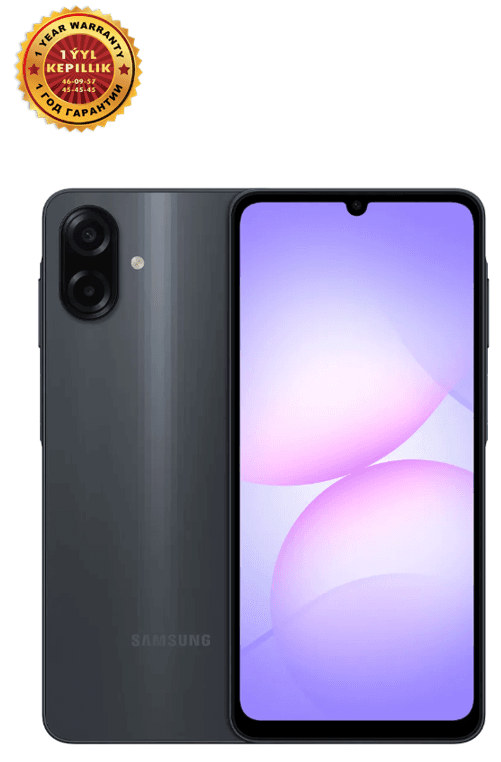 Smartfon Samsung Galaxy A07 6/128 GB, Gara — bu başlangyç derejeli, ygtybarly enjam. Displeý: 90 Hz täzelenme ýygylygy bolan 6,7 dýuýmlyk ekran bilen enjamlaşdyrylan. Matrisa görnüşi — PLS LCD, çözgüdi bolsa HD+ (720 x 1600 piksel). Öndürijilik: Sekiz ýadroly MediaTek Helio G99 prosessorynda işleýär. Ýat: Konfigurasiýa 6 GB operatiw ýady we 128 GB içki ýatgyny öz içine alýar. Şeýle hem, microSDXC karty arkaly giňeltmek mümkinçiligi bar. Kamera: Esasy kameranyň çözgüdi 50 MP, öň kameranyňky bolsa 8 MP. Batareýa: 5000 мАч kuwwatly litiý-ion batareýasy uzak wagtlap işlemegi üpjün edýär. Goşmaça: Iki SIM kartyny goldaýar, gapdal tarapdan barmak yzy skaneri we IP54 standarty boýunça tozan we suw damjalaryndan goragy bar. Enjamyň agramy 184 g. Operasion ulgam: One UI 7 interfeýsi bilen Android 15 dolandyryşynda işleýär.
