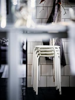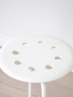 Ak reňkli oturgyç, beýikligi 45 sm. Ýönekeý, çydamly we ýeňil gurluşy bilen öýde ýa-da ofisde giňden ulanylyp bilner. Goýmaga amatly we ýer tygşytlaýar.
