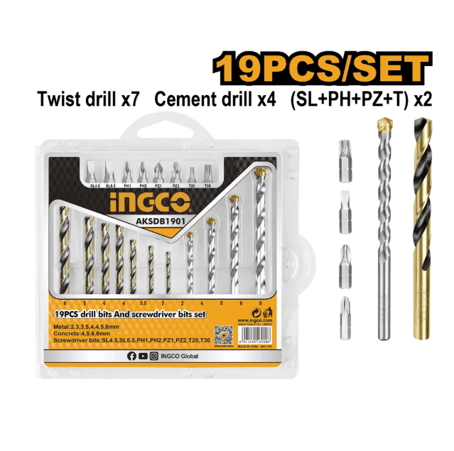 19 sany buraw we otwertka bitleri toplumy 7 sany HSS spiral burawlary (swerlo), ölçegi: 2, 3, 3.5, 4, 4.5, 5, 6 mm 4 sany daş (beton) üçin burawlar, ölçegi: 4, 5, 6, 8 mm 8 sany 25 mm-lik otwertka bitleri: SL4.5, SL5.5, PH1, PH2, PZ1, PZ2, T20, T30 Goşa blisterde gaplanan